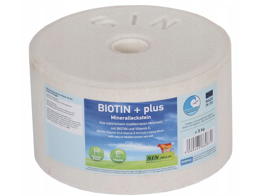 Mineralna kostka do lizania BIOTIN + plus idealnie uzupełnia sól, pierwiastki śladowe i biotynę w codziennym spożyciu paszy. Biotyna ma korzystny wpływ na budowę i wytrzymałość kopyt i sierści, co potwierdzają dane naukowe. Biotyna wspomaga rozwój komórek keratyny, a w związku z tym korzystnie wpływa na zdrowie kopyt. Znacząco poprawia się wytrzymałość rogu kopytowego. Kluczowe składniki kostki do lizania BIOTIN + plus to wysokiej jakości sól z Morza Śródziemnego z naturalnym jodem, wzbogacona pierwiastkami śladowymi, witaminą E i biotyną.