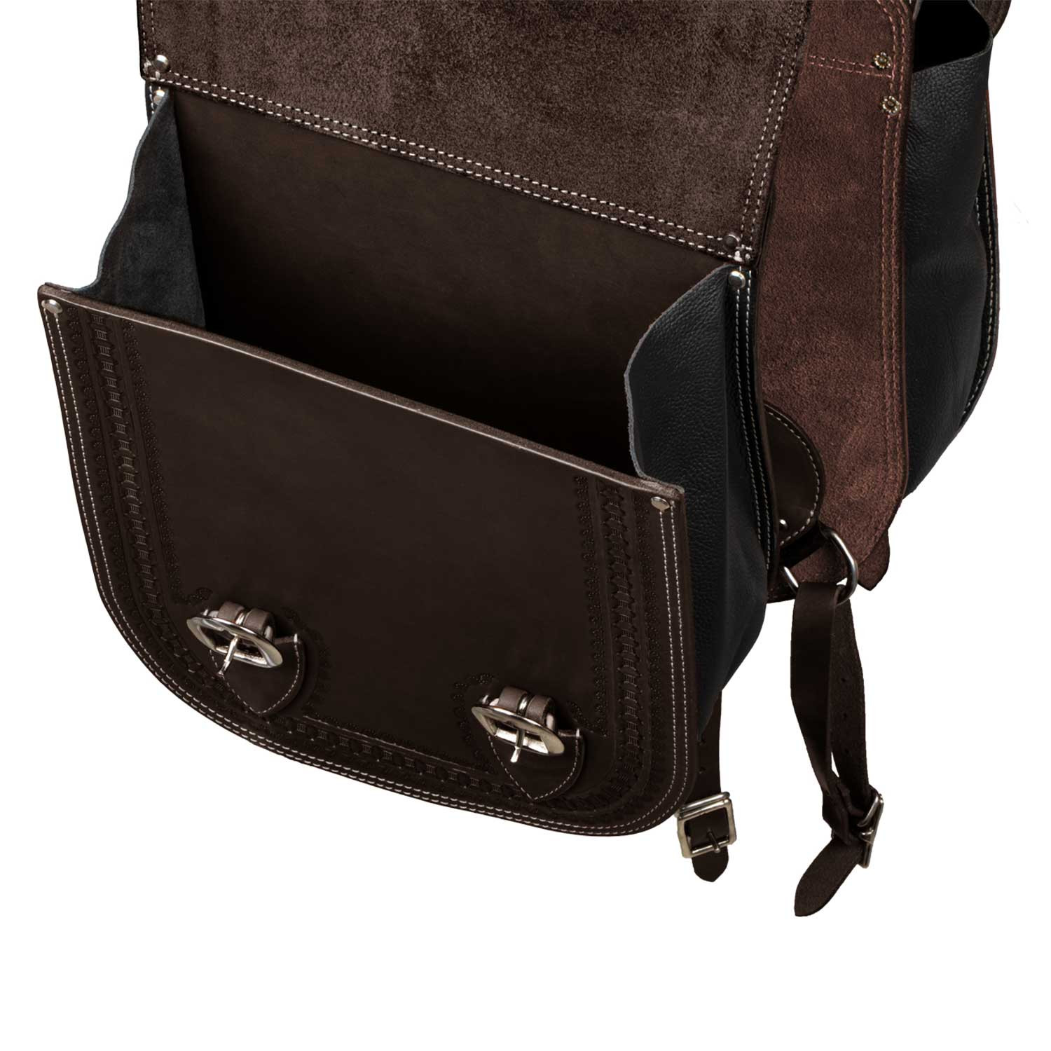 Pool's leather saddlebag with border stamp tooling. Colours: Natural Leather – Dark Brown.